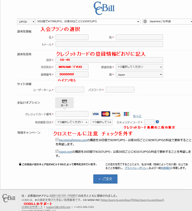 CCBILLでの入会画面はアダルト動画サイトごとにデザインが違う場合もありますが、殆ど共通です。